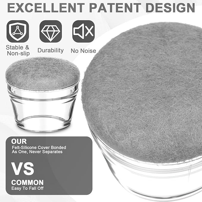 - Patented Design and Durability: our chair leg protectors have obtained the US appearance patent; The combination of TPE and felt seamlessly integrates with classroom aesthetics, effectively cushioning impact from chair movement to drastically reduce floor friction noise; The felt bottom enhances grip, keeping chairs stable and preventing sliding