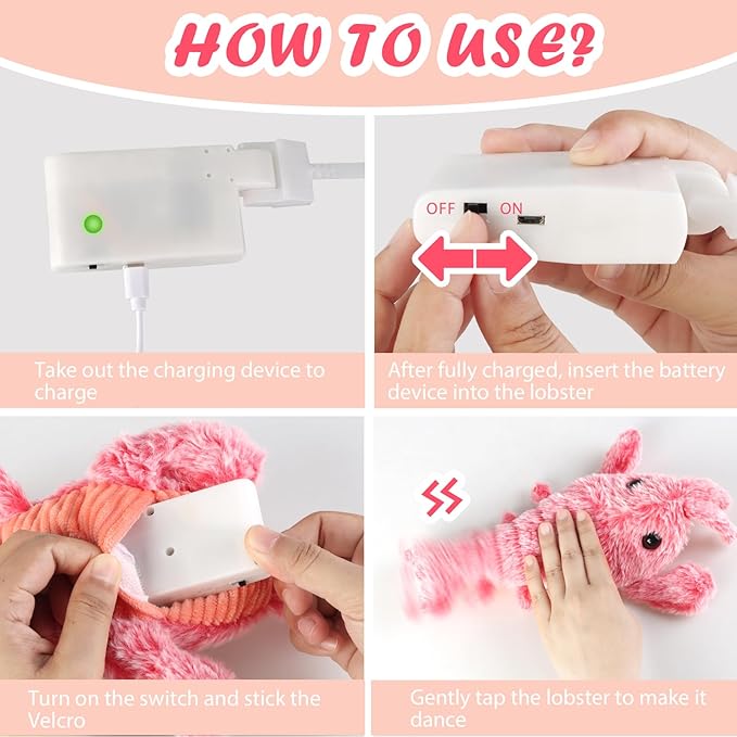 - Rechargeable Floppy Lobster Dog Toy: This floppy lobster dog toy will always accompany with your dogs without worrying about running out of battery. A 2-hour charge allows for about 200 tail wiggles, and it automatically stops moving every 12 seconds to conserve energy when inactive. Simply give the lobster a gentle pat to reactivate