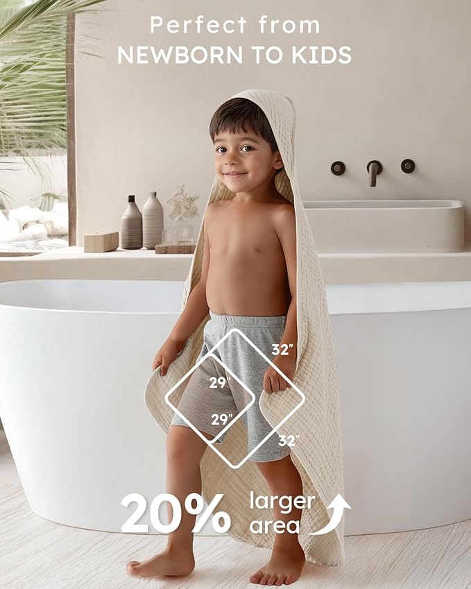 - [Excellent Durability] - The 6 layers thickness muslin design is long-lasting enough for everyday use. Sized in 32 x 32 inches, the hooded baby towels are suitable for newborns, infants, toddlers, and small kids up to 3 years old.