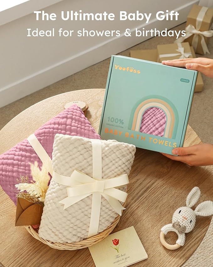 Yoofoss Hooded Baby Towels for Newborn 2 Pack 100% Muslin Organic Cotton Baby Bath Towel with Hood for Babies, Infant, Toddler and Kids, Large 32x32Inch, Soft and Absorbent Newborn Essential