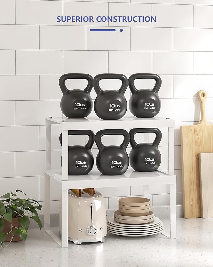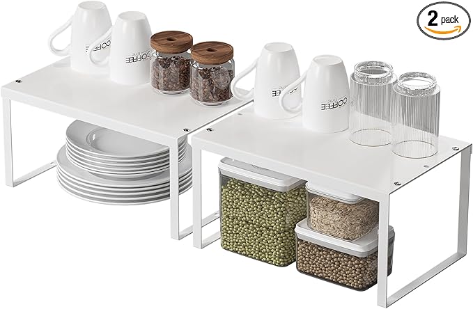 Cabinet Organizer Shelf, Set of 2 Cabinet Shelves, Stackable Metal Kitchen Counter Organizer, Adjustable Countertop Cupboard Pantry Shelf Riser Storage Rack, WHite