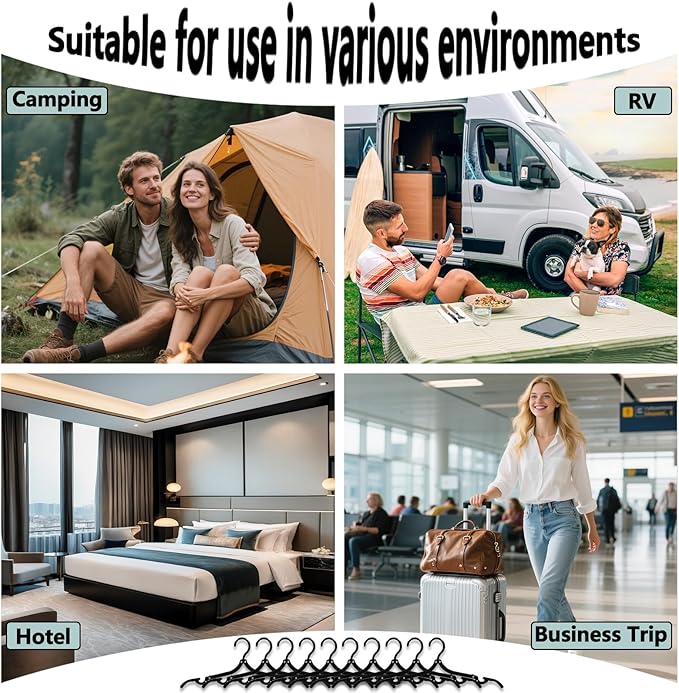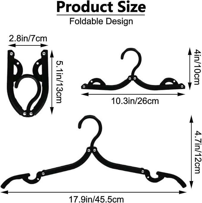 - Folding hangers: Our travel hangers fold neatly, making them a must-have for hanging clothes at home and on business trips. They're perfect for hanging clothes at home, saving valuable closet space. They can also be used outdoors, camping, or traveling, easily fitting into your bag or suitcase, saving valuable space. They're perfect for traveling, camping, flying, RVs, cruises, and more