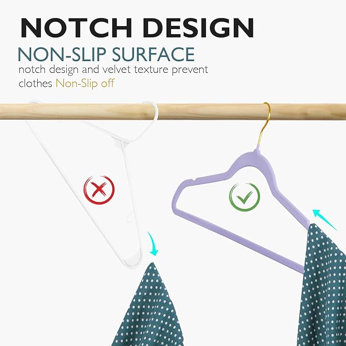 - [Velvet Texture]: Full of high quality flocked velvet on hangers holds your clothes tightly preventing the clothes from slipping. As strong as wooden suit hanger but much thinner and lighter.