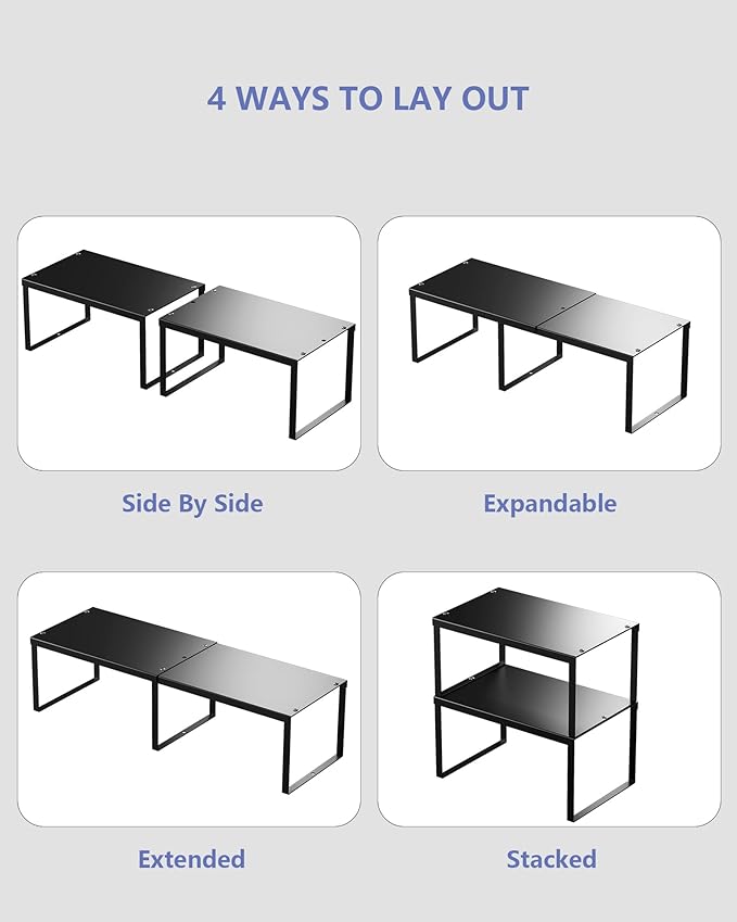 - Adjustable and Expandable: With four different combination methods, including individual use, stacking, extended stacking, and adjustable length, these shelves offer flexibility to adapt to your specific storage needs. They can be easily adjusted and expanded to accommodate varying item sizes.