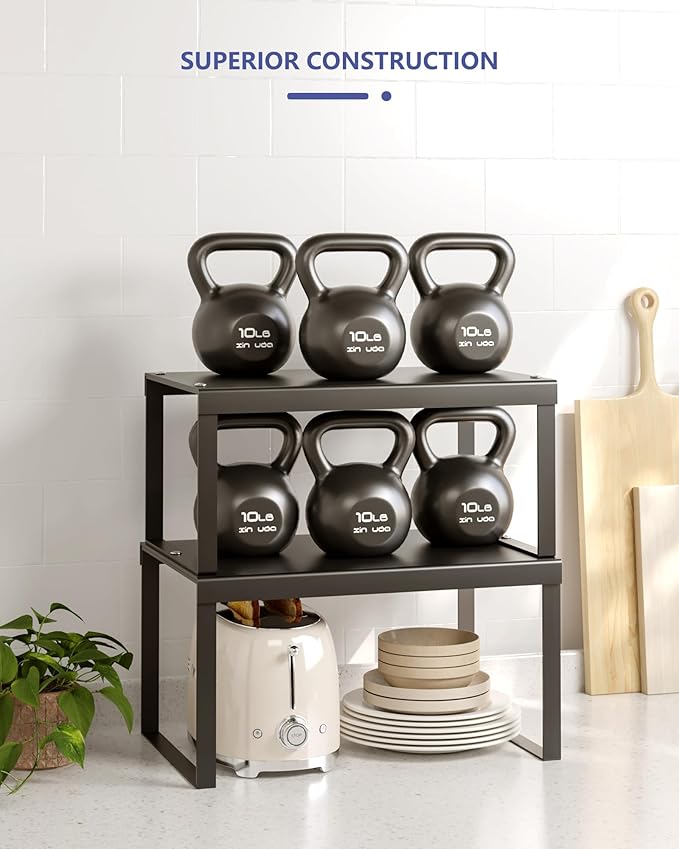 Cabinet Organizer Shelf, Set of 2 Cabinet Shelves, Stackable Metal Kitchen Counter Organizer, Adjustable Countertop Cupboard Pantry Shelf Riser Storage Rack, Black