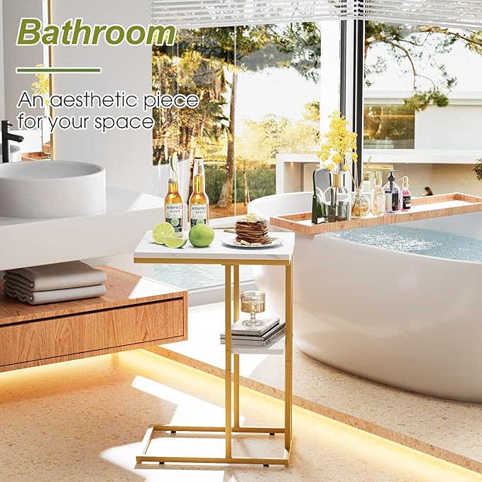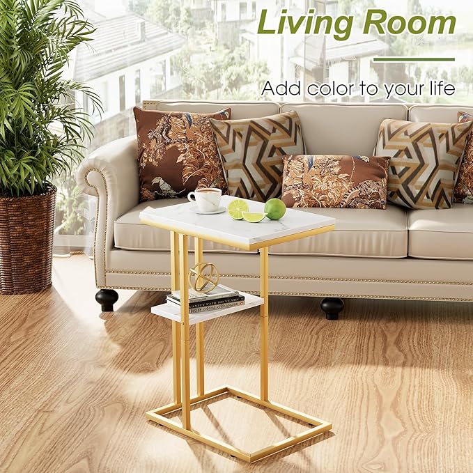 C Shaped End Side Table, Couch Sofa Table for Bed, Gold Snack Table with Metal Frame, TV Tray Table for Small Space, Living Room, Bedroom, Bedside(White Marble)