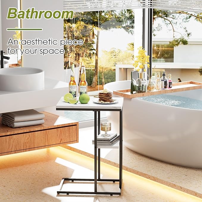 C Shaped End Side Table, Couch Sofa Table for Small Space, Black Snack Table with Metal Frame, TV Tray Table for Bed, Living Room, Bedroom, Bedside(White Marble)