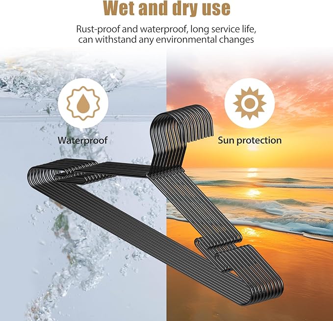 - 【Wet and Dry】Our aluminum hangers use the latest electroplating technology, which can be completely waterproof, rust-proof and fade-proof. They are ideal for protecting delicate clothing. Even if the aluminum hangers are soaked in water for a long time, they will not fade or rust.