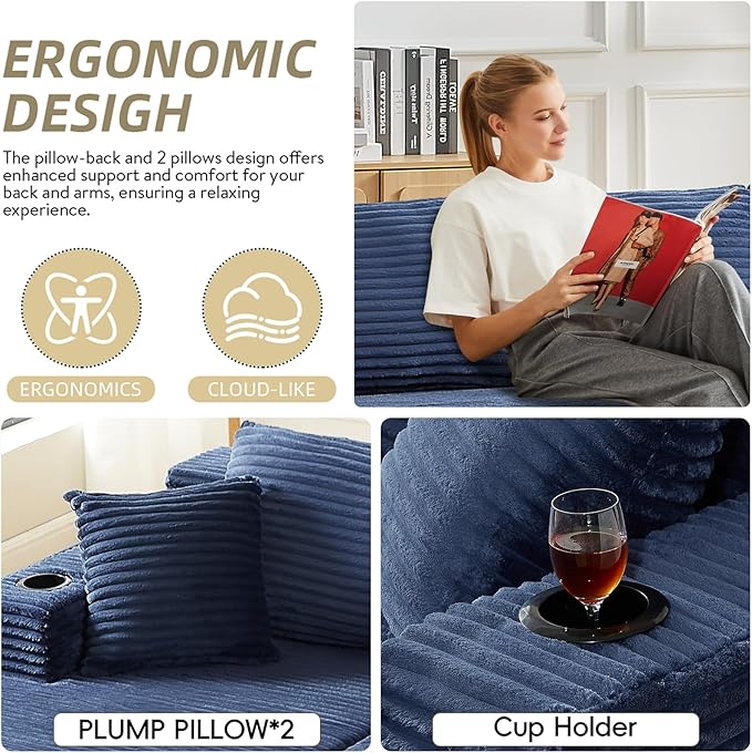 - 【Built-In Cup Holders】 Enjoy easy access to beverages with integrated cup holders in the armrests,providing a convenient and secure place for your drink as you relax in this boneless couch.