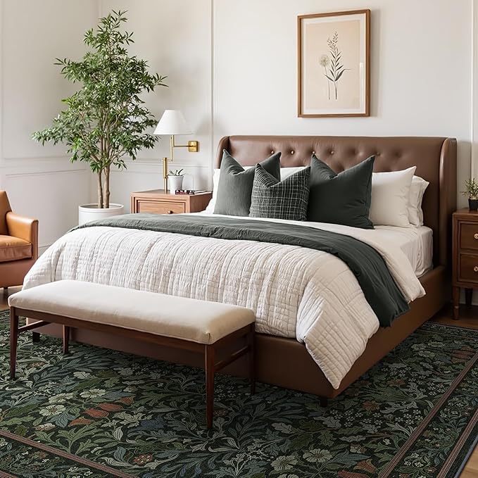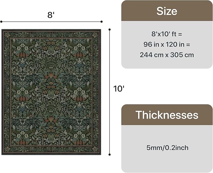 GENIMO 8x10 Washable Area Rug, Non-Slip Vintage Boho Floral Carpet, Soft Low-Pile Thin Living Room Rug for Bedroom, Dining Room, Nursery, Dark Green