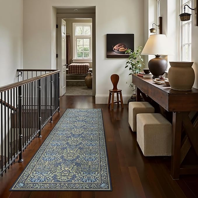 GENIMO Floral Washable Runner Rug 2’6”x8’, Non-Slip Long Hallway Carpet for Entryway, Kitchen, Indoor Floor Use, Vintage Boho Soft Thin Rug Décor, Dark Blue