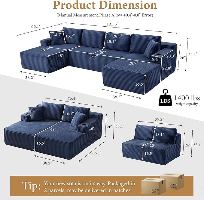 133" Couches for Living Room Deep-Seat Sectional Couch for Living Room Corduroy Boneless Couchs U-Shape Cloud Couch Flexible Modular Sectional Sofa with Chaise Lounge (Blue, with Cup Holder)