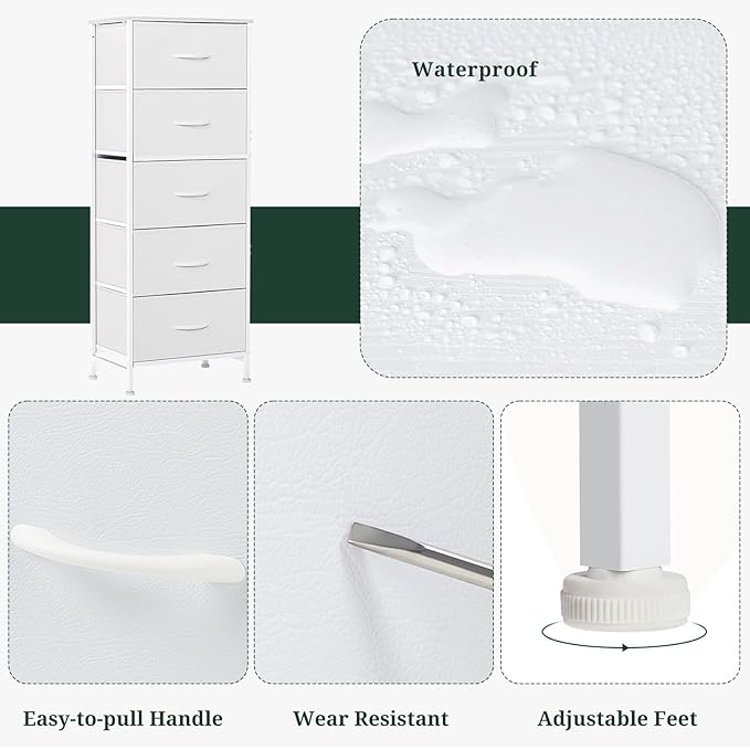 Nightstand, 5 Drawer Dresser End Table Bedside Furniture with Wooden Top Steel Frame Fabric Bins for Bedroom, Closet, Entryway, Dorm, Living Room, White