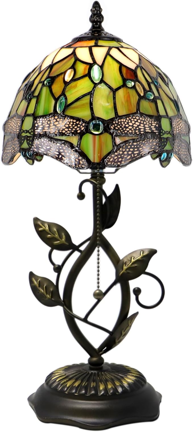 Small Tiffany Lamp Yellow White Dragonfly Style Stained Glass Table Lamps Desk Bedside Reading Light 8X8X18 Inches with Bronze Metal Leaf Resin Base