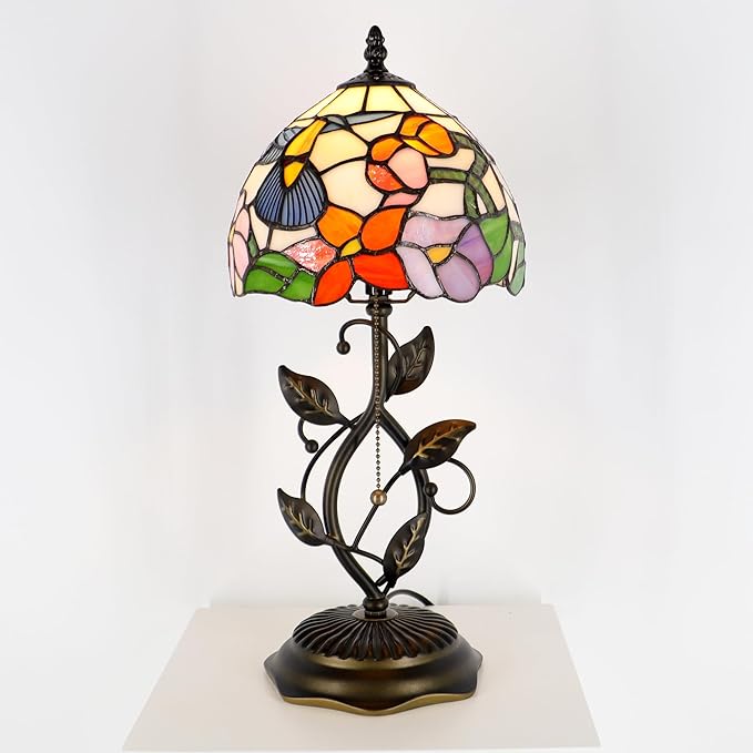 Small Tiffany Lamp Hummingbird Style Stained Glass Table Lamps Desk Bedside Reading Light 8X8X18 Inches with Bronze Metal Leaf Resin Base