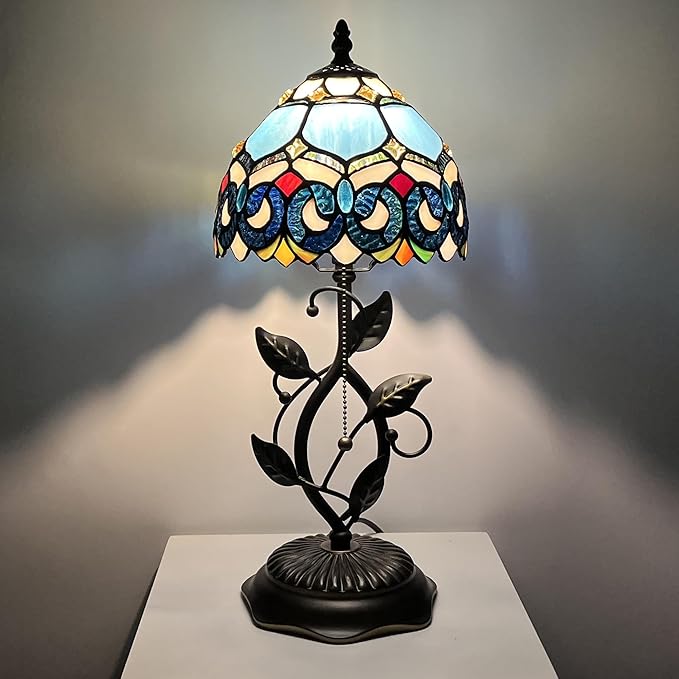 Small Tiffany Lamp Sea Blue Jewelry Baroque Style Stained Glass Table Lamps Desk Bedside Reading Light 8X8X18 Inches with Bronze Metal Leaf Resin Base