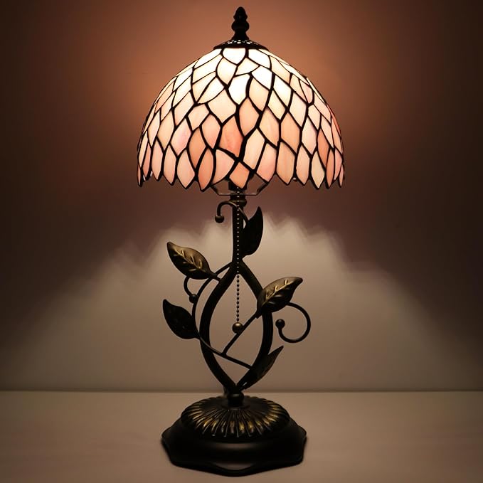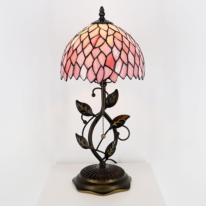 Small Tiffany Lamp Pink Leaf Style Stained Glass Table Lamps Desk Bedside Reading Light 8X8X18 Inches with Bronze Metal Leaf Resin Base