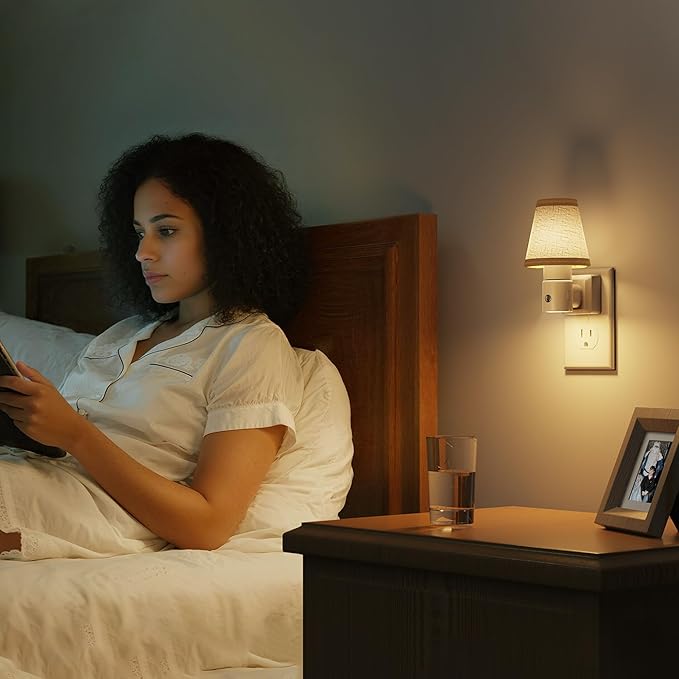 - LOHAS Decorative Night Lights Plug into Wall: This versatile, stable plug in night-light is made with a beige fabric shade and gives off a 3000K warm white glow—good for bedrooms, living rooms, hallways & bathrooms.