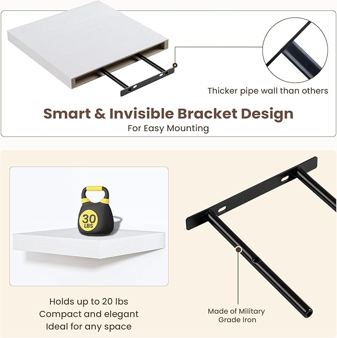 - Invisible Bracket System: Each shelf is supported by an invisible bracket system, creating a "floating" effect that enhances the sleek, modern look of your space. The hidden brackets eliminate visible hardware while providing sturdy support, with each shelf holding up to 8 pounds without compromising stability.