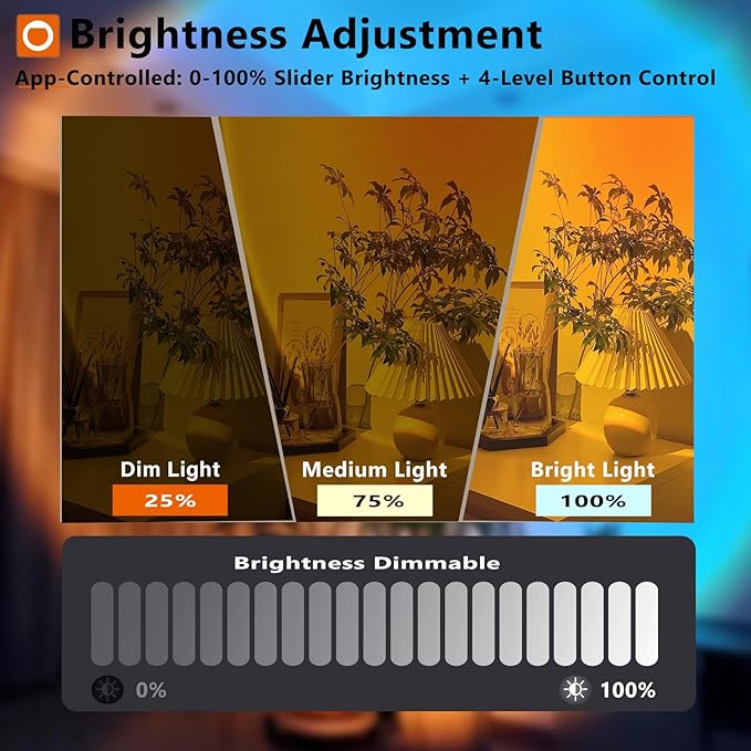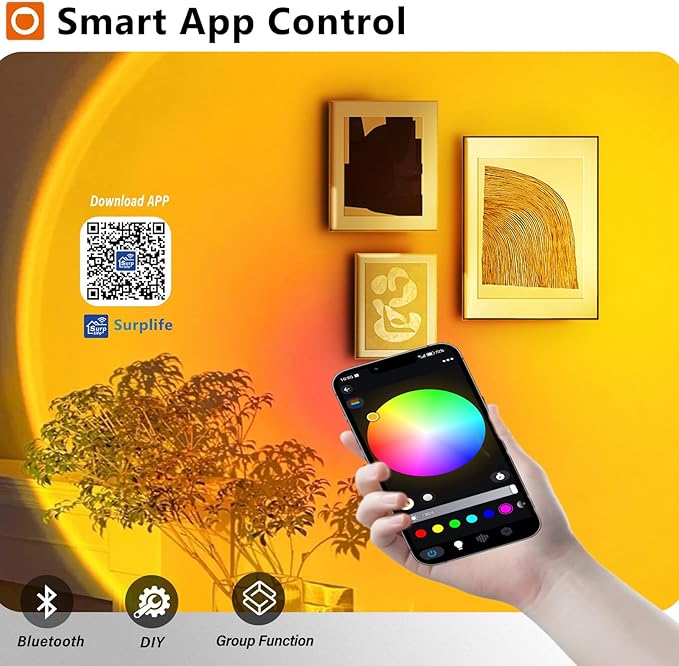 - 【Smart APP Intelligent Control】:Blending artistic aesthetics with smart technology, the sunset light breaks the limit of fixed color modes. Through the dedicated app, you can access advanced functions: customizable RGB color palette, dynamic light rhythm adjustment, music sync, microphone sound control, and timer setting. One simple tap on your phone, and a stunning light show will instantly fill your space.