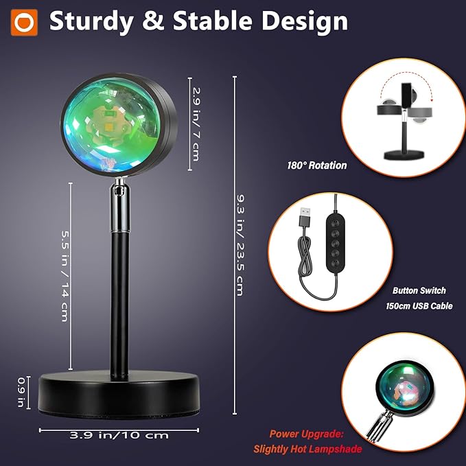 - 【Portable & Flexible Design】:With a compact and lightweight body, this sunset lamp supports plug-and-play use. It is easy to carry for outdoor trips or on-the-go shooting. The projection size can be freely adjusted by changing the distance from the wall, while the 180° rotatable lamp head allows you to cast beautiful light on walls, ceilings, or floors—unleashing your creativity.