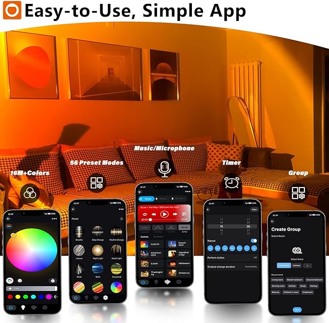 - 【One-Tap Switch & Multi-Device Group Control】:Operation is effortless: switch between colors, modes, and custom settings in one tap—either via the lamp’s physical button for quick adjustments, or through the dedicated mobile app for full control. The app also features a group management function: if you own multiple units, you can pair all of them to the app and control them simultaneously (e.g., syncing the same sunset effect across living room, bedroom, and balcony). This seamless control ensures consistent ambiance and saves time, whether for daily use or party setup.