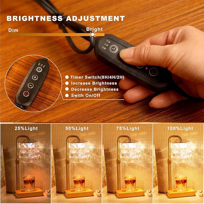 - 【Timer and Dimming Function】This wax wamer has timer and dimming function. You can select 2H/4H/8H timer settings, eliminating concerns about forgetting heating times. I It also offers 4 adjustable brightness levels, controllable via the switch or remote. Equipped with two 50W GU10 halogen bulbs, brighter light makes candles melt faster and releases a stronger fragrance.