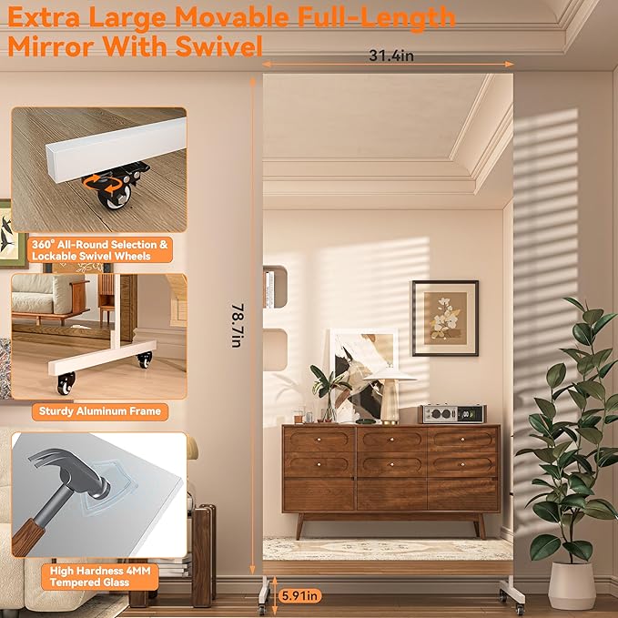 Hasipu Home Gym Mirror 360° Swivel on Wheels, 78.7" x 31.4" Extra Large Full Body Rolling Mirror for Yoga Studio, Bedroom, Dancing Studio, White