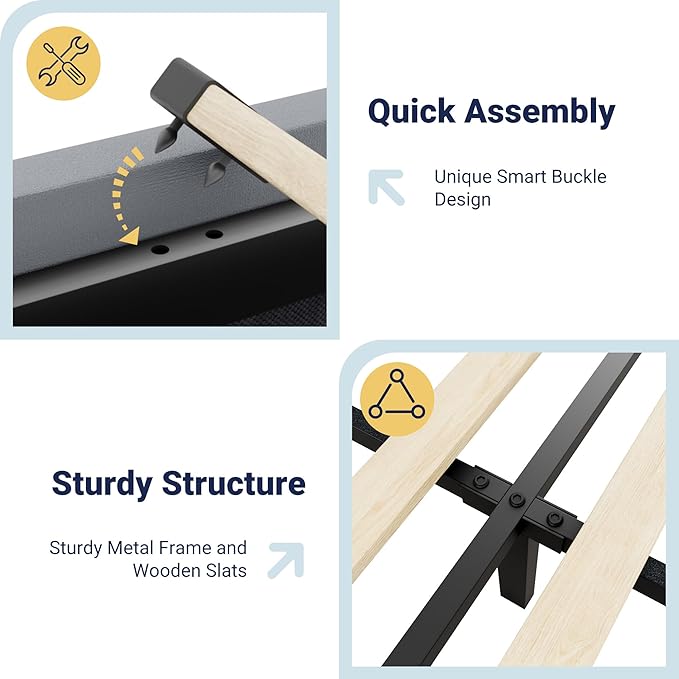 - Stable Reinforced Frame: Built with a heavy-duty metal frame and thickened wood strips, it provides stable support and extends the lifespan of the bed. No box spring is required, and the EVA silent strips eliminate friction noise from slats, ensuring a comfortable sleep