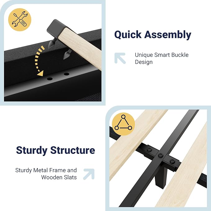 - Stable Reinforced Frame: Built with a heavy-duty metal frame and thickened wood strips, it provides stable support and extends the lifespan of the bed. No box spring is required, and the EVA silent strips eliminate friction noise from slats, ensuring a comfortable sleep