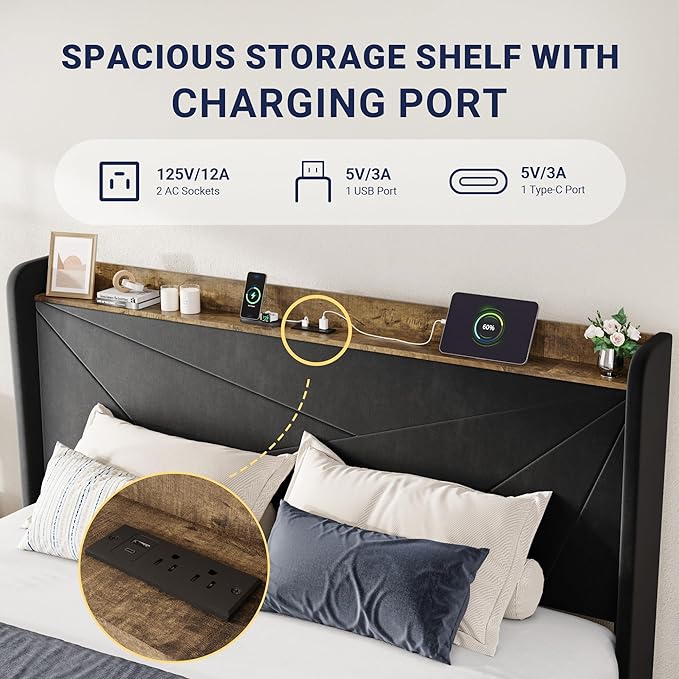 - Built-in Charging Station: The headboard features a fast-charging station with 2 AC outlets, 1 USB port, and 1 Type-C port. Multiple devices can be charged at the same time, fully meeting pre-bedtime entertainment and work charging needs