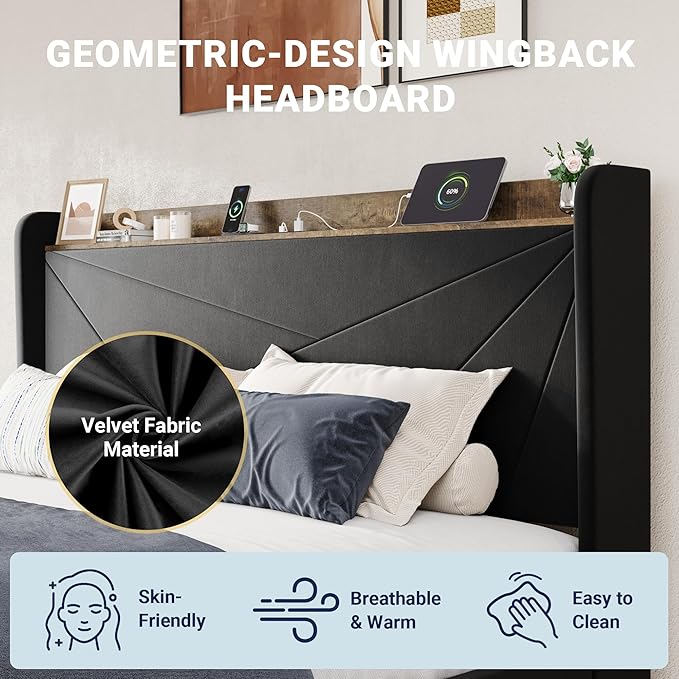 Allewie King Size Velvet Bed Frame with 3 Storage Drawers, Upholstered Platform Bed with Wingback Storage Headboard and USB Ports, No Box Spring Needed, Easy Assembly, Black