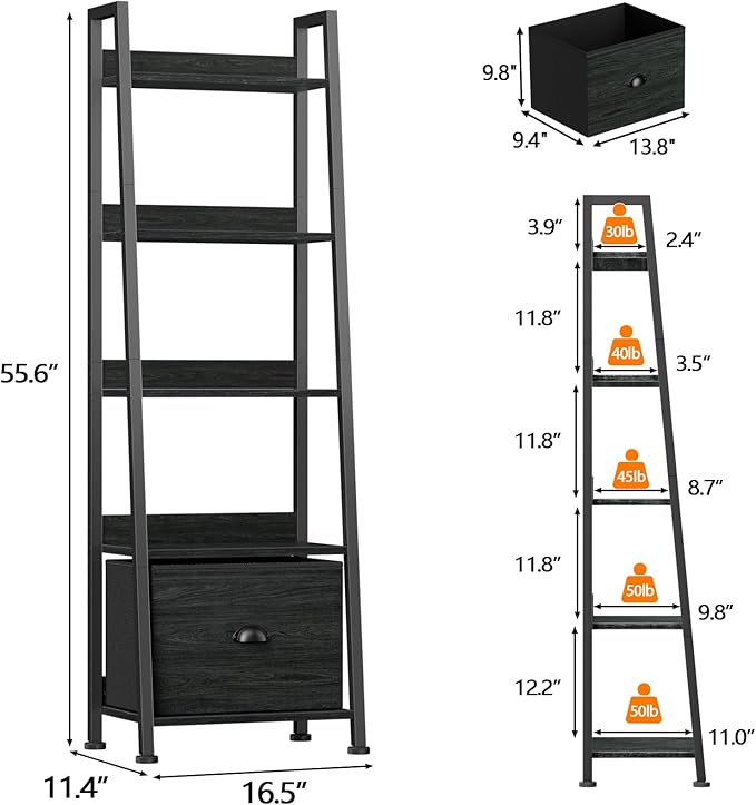 - Extra Fabric drawer: Our black ladder shelf with an additional large fabric drawer which is light and soft, matches 5 tier shelves to store books, CDs, toys or other items, not only to prevent children from accidentally bumping into corners and injuring themselves, but also to make full use of vertical space to keep your home, office, apartment tidy and organized.