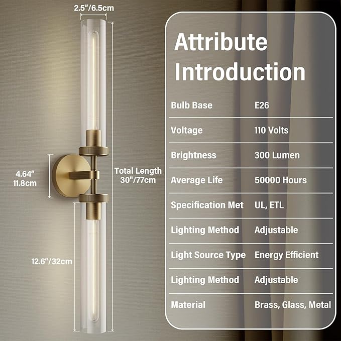 - 【Larger Size】: The Thickened Glass Shade Is Treated With A Special Process To Make It Harder And Clearer. The Size Of The Glass Tube Is 12.8" L*2.5" D, And The Total Length Of The Wall Sconce Is 30". The Wall Sconce Weighs 5.5 Lbs.The design of the bathroom light allows for this bathroom sconce to be installed in an up or down direction. You can choose the direction according to your needs.