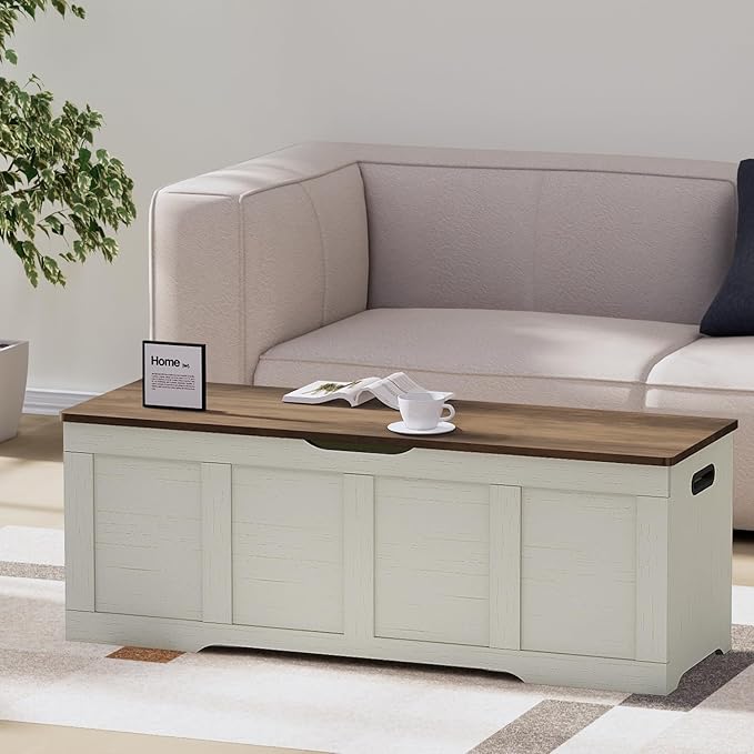 47.2" Storage Chest, Extra Large Storage Trunk with 2 Safety Hinges, Wooden Storage Bench, Shoe Bench, Entryway Bench for Living Room, Bedroom, Brown and Rustic White