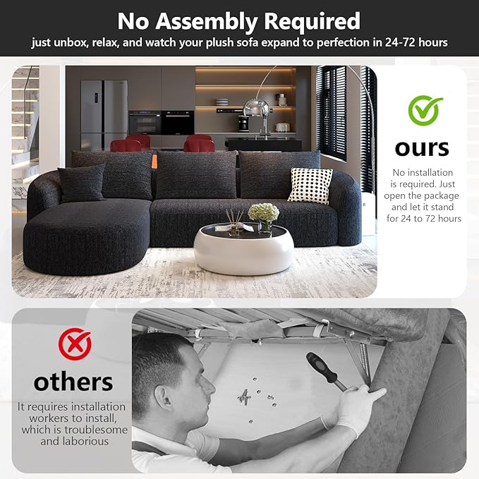 - No Assembly Required:Be ready in 1 step! Setting up this cloud couch is incredibly easy. Simply unbox the cushions, place them together, and let them naturally expand over 24-72 hours. No extra tools or complicated assembly steps are needed. It’s ready to use this cloud sofas for living room with minimal effort.