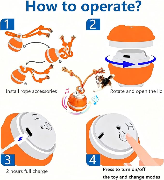- 【Squeaky Dog Toy with Birdsong Control】 Default chirping attracts dogs (double-click to mute). This interactive dog ball's rope dances erratically, combining the appeal of squeaky dog toys with the intelligence of smart dog toys.interactive dog toys for small dogs. Irregular smart rolling with a long rope teaser provides hours of rolling fun,Connect the automatic moving ball with long rope,then activate the ball. the birds chirping sound will attract your pet's interest, keep your dog entertained,peppy pet ball for dogs