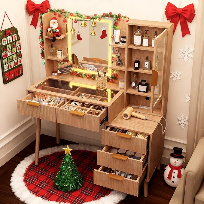 - Vanity Table with Charging Station: Built-in power outlets support hairdryers, straighteners, or chargers. This vanity table allow you to conveniently connect and charge hair tools, smartphones, tablets, and other devices, making this vanity practical for daily use. Also, this vanity organizer is a great gift for birthdays, Valentine's Day, Mother's Day, and Christmas