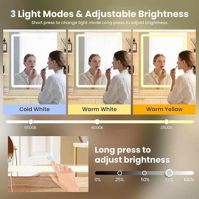 - LED Mirror and Customizable Lights: The LED mirror will prioritize your makeup experience, which can reflect your appearance more clearly from every angle.The adjustable LED mirror provides three lighting modes—Cool (6500K), Warm (3500K), and Natural (4500K)—with touch controls to switch modes and adjust brightness. Ideal for different scenes as home, salons, and studio makeup applications