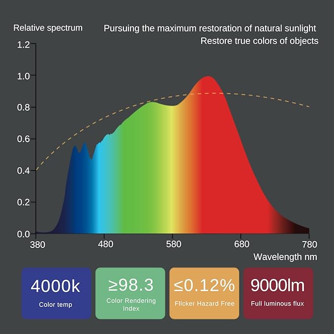 - 【9000LM Wide Coverage & True Color Accuracy】 Features an innovative Up/Down Illumination Design providing up to 9000LM of soft brightness. Light reflection uniformly covers a wide area of 172 sq ft, eliminating shadows. Boasts a 4000K Natural Color Temperature and CRI ≥98.3 to guarantee precise color reproduction.