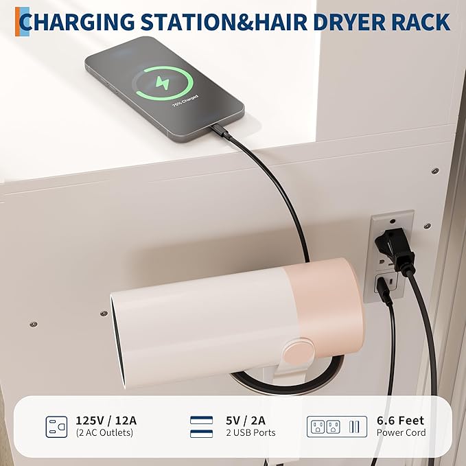 - Built-In Charging Station: Stay powered up while you style, with a built-in charging station featuring two AC outlets, one USB port, and a Type-C port. Effortlessly plug in your phone, hair tools, or other devices right at your makeup desk.