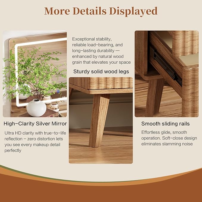 - 【Simple and Delicate Appearance Design】The large rectangular cosmetic mirror provides a wider view and makes makeup easier, the gold handles and elegant Walnut appearance are simple, elegant and stylish.This vanity desk with mirror and lights can perfectly match your other furniture and add magic and fashion charm to your room