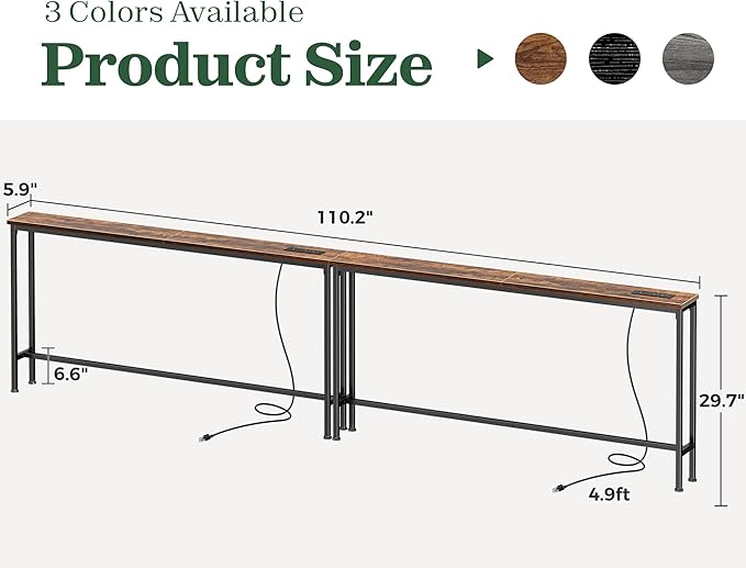 - 【2 Flexible Power Outlets】This 110.2 inch long console table comes with a built-in power strip featuring 2 AC outlets, 1 USB port, and 1 USB-C port. Even better, you can position the outlets on either side of the narrow table to perfectly suit your setup. Charge your laptop, phone, tablet, or game controller without bending over or wrestling with wall outlets blocked by furniture—convenience right at your fingertips