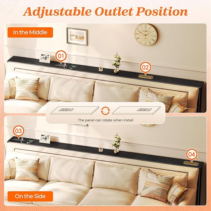- 【Flexible Power Outlet】This 102.4-inch long console table features a built-in power outlet with 2 AC ports, 1 USB port, and 1 USB-C port. Designed for ultimate flexibility, the outlet can be installed in 4 different positions to perfectly fit your space and setup. Easily charge your laptop, phone, tablet, or game controller without reaching behind furniture — power and convenience, exactly where you need it