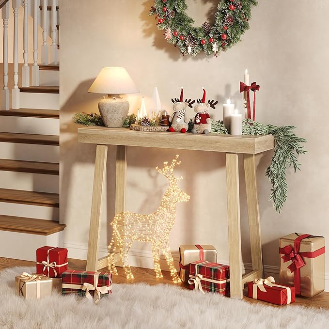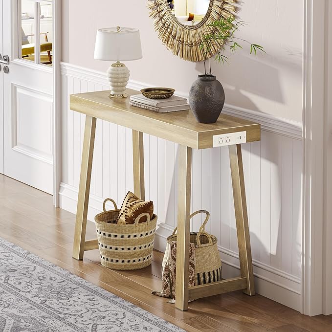 - 【Built-in Side Charging Station】Say goodbye to awkward outlet searches. This entryway table comes with a side power station (2 AC + 1 USB + 1 Type-C), perfect for powering table lamps, diffusers, holiday décor, or charging your phone. Because the front and back look identical, you can place the outlet on either side, left, right