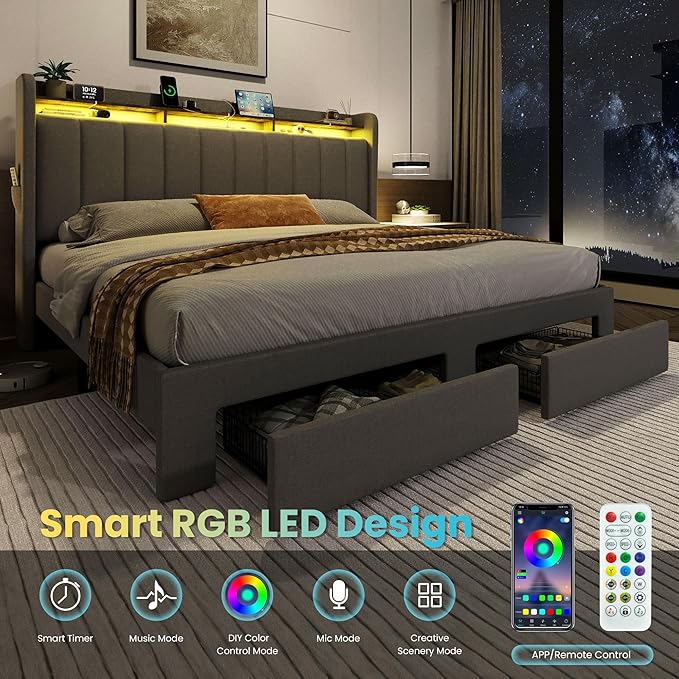- Multicolor RGB LED Lighting: Ambient LED lighting integrated into the headboard complements the king size bed frame. Use the included remote or the mobile app to customize color, brightness, lighting modes and timer settings to suit different styles and scenes, bringing versatile mood-enhancing illumination to your bedroom