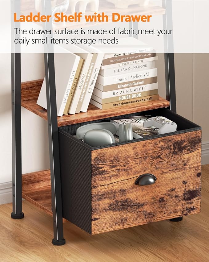 Furologee 6 Tier Ladder Shelf,Ladder Bookshelf with Drawer,Industrial Tall Bookcase,Storage Rack Organizer,Wood Metal Freestanding Shelves for Living Room, Home Office, Bedroom,Rustic Brown