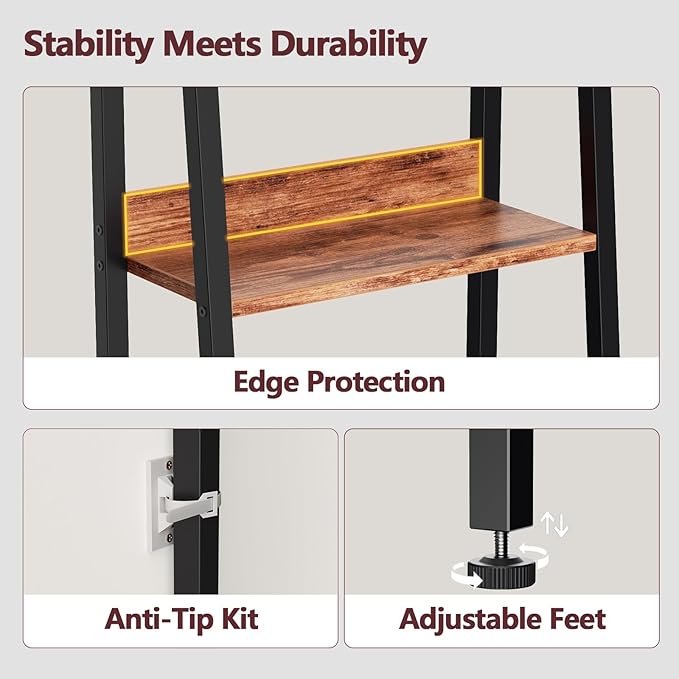 - Premium Material: The edges of each shelf are designed with backboards to protect your items from falling off. Also, this 6-tier ladder shelf is made of high-quality particle board and solid black metal frame, which is waterproof and durable. Besides, 4 adjustable foot can keep the storage rack organizer stable on the uneven floor and prevent you scratch the floor by moving storage shelves.