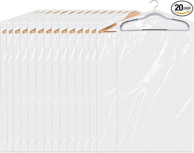 - 【WIDELY USE】 You will receive 20clear garment bags for hanging clothes, jackets, suits, dresses, trousers, and shirts while protecting them from dirt and dust, ensuring a well-organized and fresh wardrobe Clothes bags for hanging are suitable for personal or professional use at the dry cleaner, retail store, tailor shop, or at home.