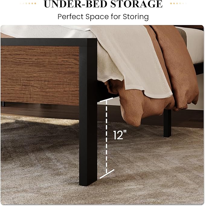 SHA CERLIN 14 Inch Twin Size Metal Platform Bed Frame with Wooden Headboard and Footboard, Mattress Foundation, No Box Spring Needed, Large Under Bed Storage, Heavy Duty Slats Support, Walnut